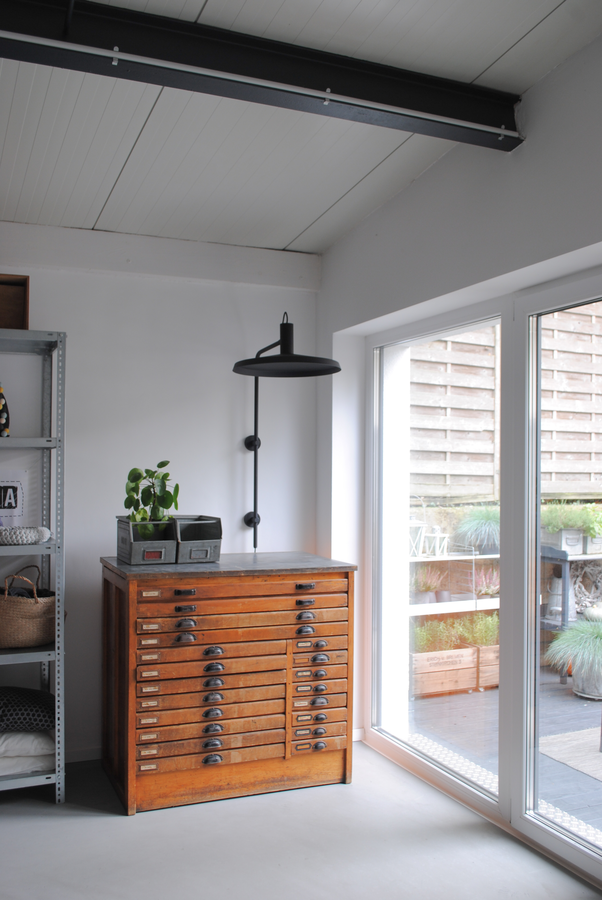 "The subject of lighting in my studio has been on my mind for some time. I wanted to use several vintage industrial and modern design luminaires to emphasise the loft character and finally found them at @weverducre. I have chosen several luminaires as I am not only enthusiastic about the quality but also about the design. The first one I would like to show you today, a wall lamp from the ROOMOR collection. I think it fits in here wonderfully and blends in really well with the surroundings. What do you think? Inspired by the design style of the 20's with its eye-catching wiring, the luminaire is available in different colours and different versions, whether for a desk or as a floor, ceiling or wall luminaire. I have chosen this all-black version and I am really happy with it. The high-quality workmanship, the design and the easy installation simply convinced me.