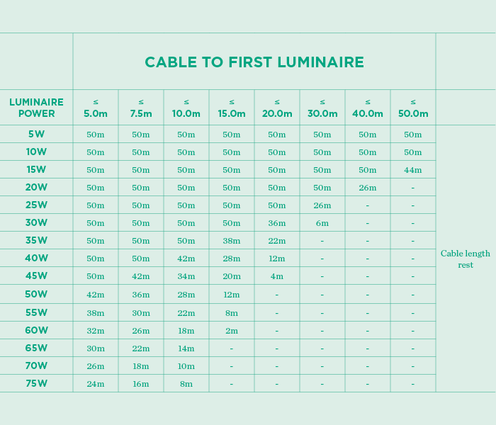 Le nombre de lampes d’extérieur que vous pouvez installer avec un système de connecteurs 24V Plug & Play dépend de la distance entre le driver et la première lampe. Il est donc important de garder à l’esprit la longueur du câble (voir graphique). Par défaut, chaque driver est équipé d’un câble de 2,5 m de chaque côté.